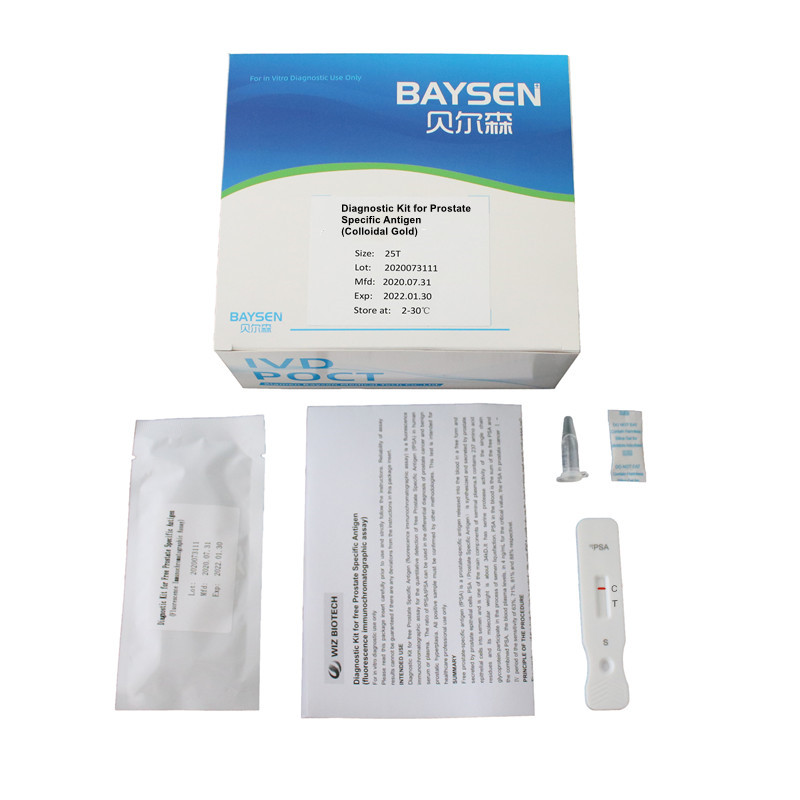 Diagnostic Kit for Prostate Specific Antigen (Colloidal Gold ) is a semi-quantitative detection of Prostate Specific Antigen (t-PSA) in human serum or plasma. The ratio of t-PSA can be used in the differential diagnosis of prostate cancer and benign prostatic hyperplasia.